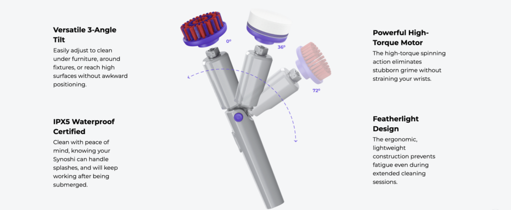 The design of Synoshi focuses on common household challenges such as hard-to-reach areas, stubborn residue, and repetitive scrubbing. Its interchangeable brush heads are meant to adapt to different surfaces and cleaning needs, making it useful for bathrooms, kitchens, tiles, sinks, and other areas where dirt tends to accumulate.